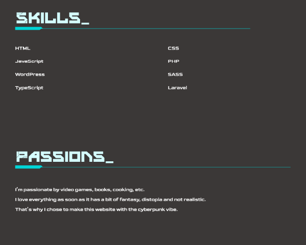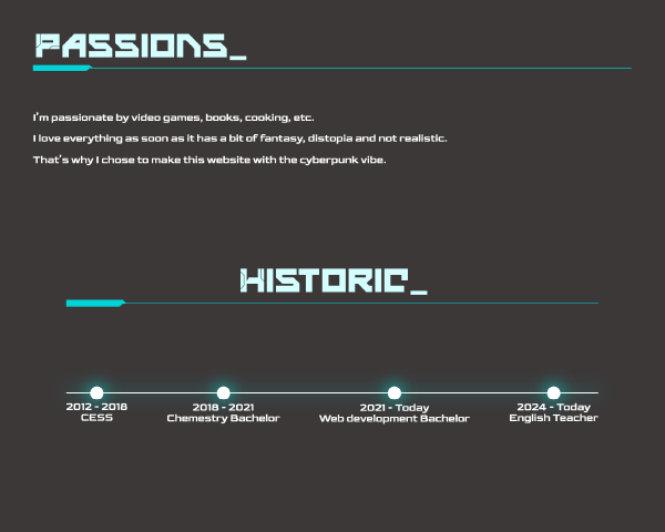 This portfolio is the result of my desire to create a professional showcase that truly reflects who I am combining thoughtful design with a strong demonstration of technical skills. Built to make a strong first impression, it highlights my web development expertise, attention to detail, and interest in the cyberpunk aesthetic.